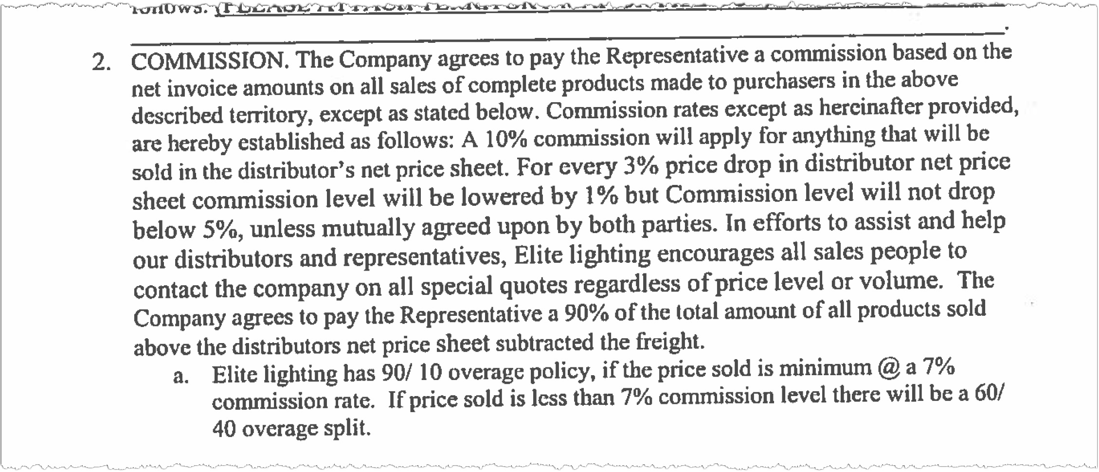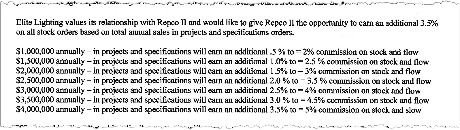 The addendum signed by Repco II in 2022, outlines an agreement for Elite stock orders from Scott Electric, Cardello, Hite, Mayer, Rexel, Gexpro, Yesco and others to be handled directly from the factory, whle awarding Repco II a base commission of 1.5%. Higher stock commission percentages would be earned as specification and project revenues climb from $1 million to $4 million. Project orders were to be handled by Repco II at commissions of 5% or more.