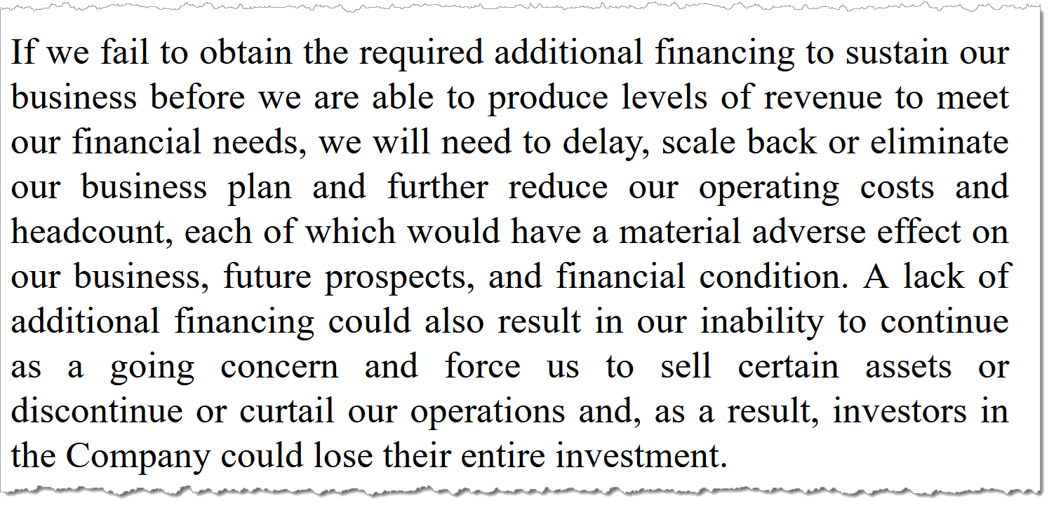 It is a technical phrase with plain implications. Without additional funding, the company may not sustain operations. Management acknowledges as much, outlining scenarios that include reducing headcount or curtailing the business entirely.