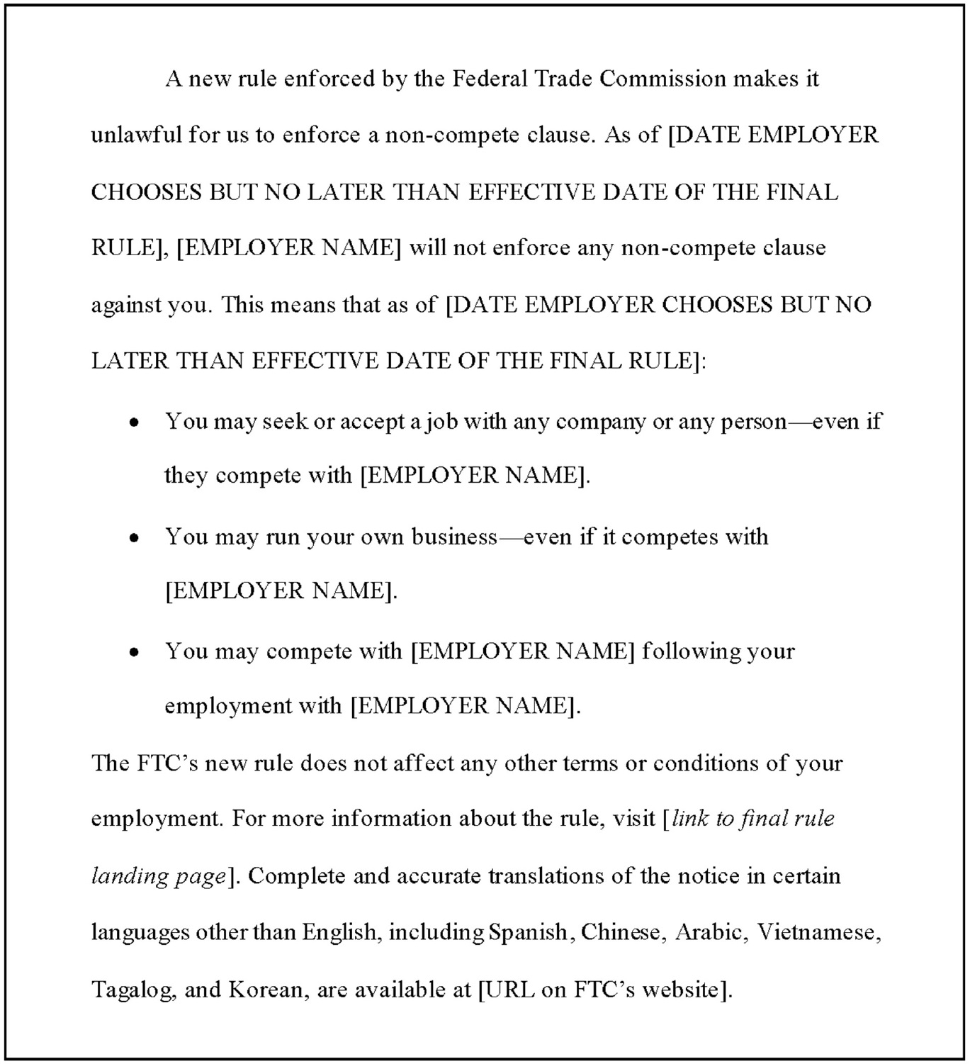 The FTC proposes that the specified model language below should serve as notification to the employee that their non-compete clause is unenforceable and will not be enforced.