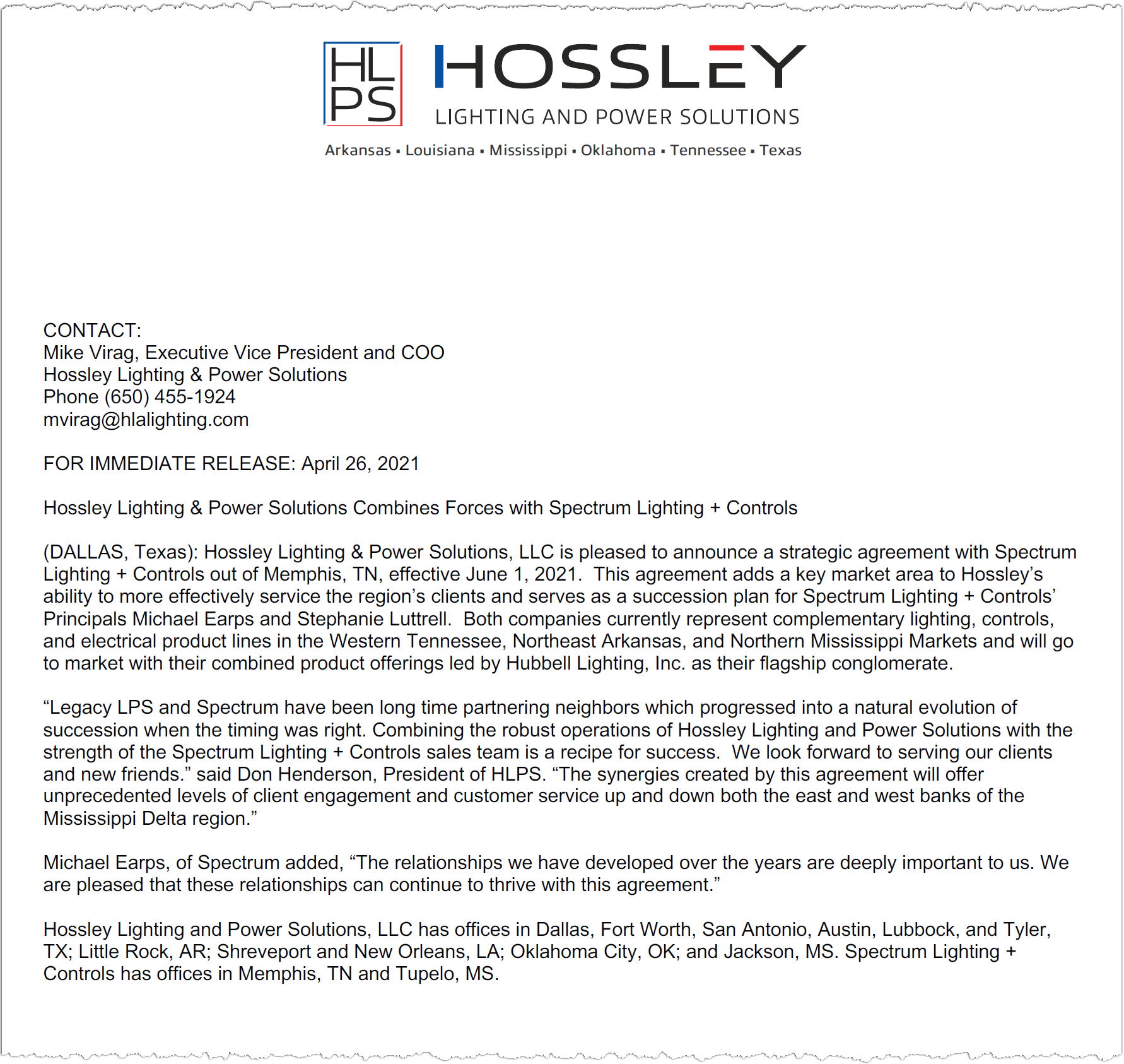 The relationship between HLPS and Spectrum Lighting + Controls is a strategic partnership. This is not a business merger or an acquisition. The companies will go to market in Western Tennessee using the Hossley Lighting & Power Solutions name. Before this agreement, HLPS represented mainly electrical supply lines including Eaton Power Quality and Energy Focus in the Western Tennessee market.