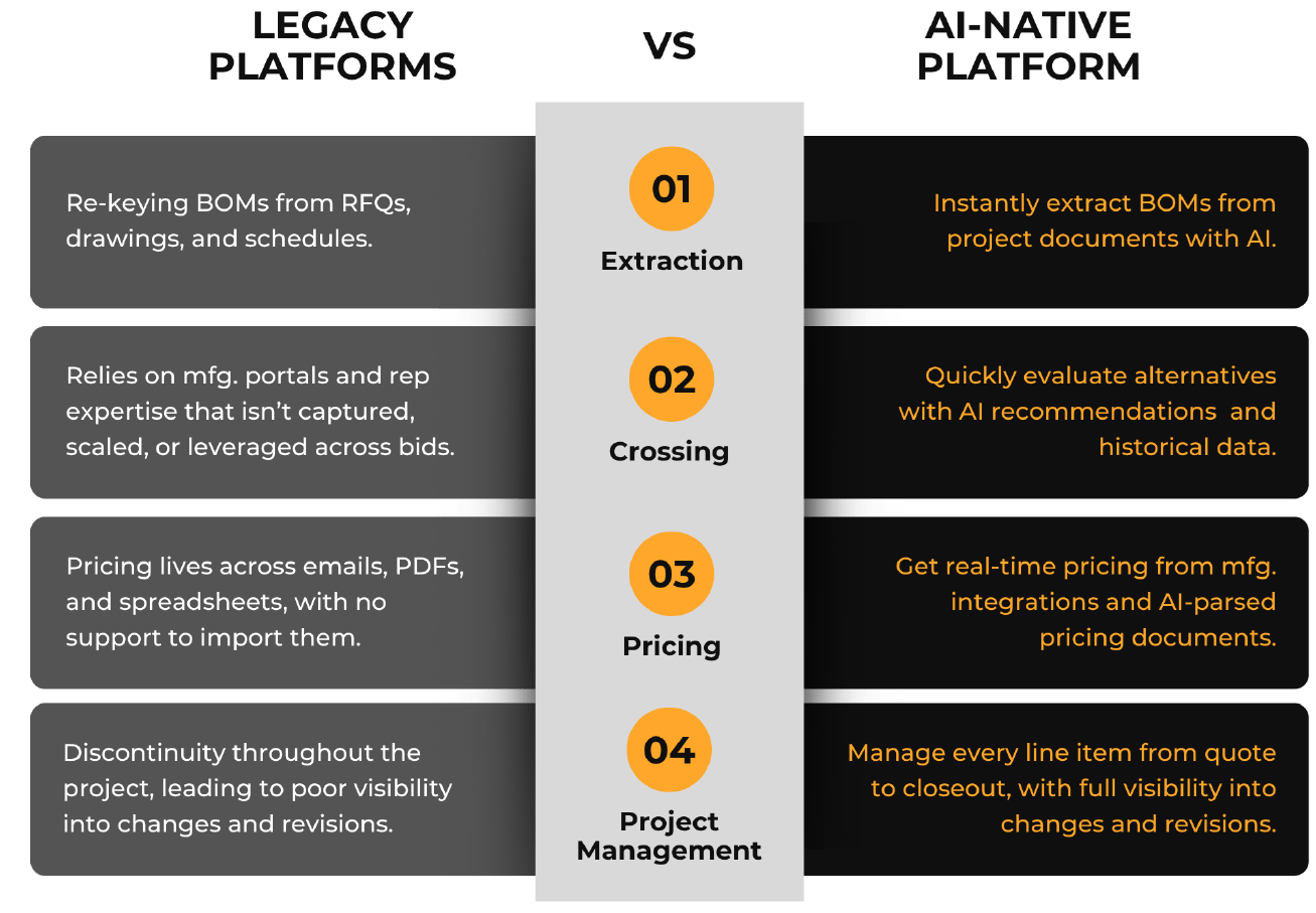Parspec uses AI to automatically ingest RFQs and extract a structured bill of materials from drawings, schedules, and other formats, eliminating the need for manual BOM entry. By reducing errors and accelerating the quoting process, teams can respond faster and with greater confidence.