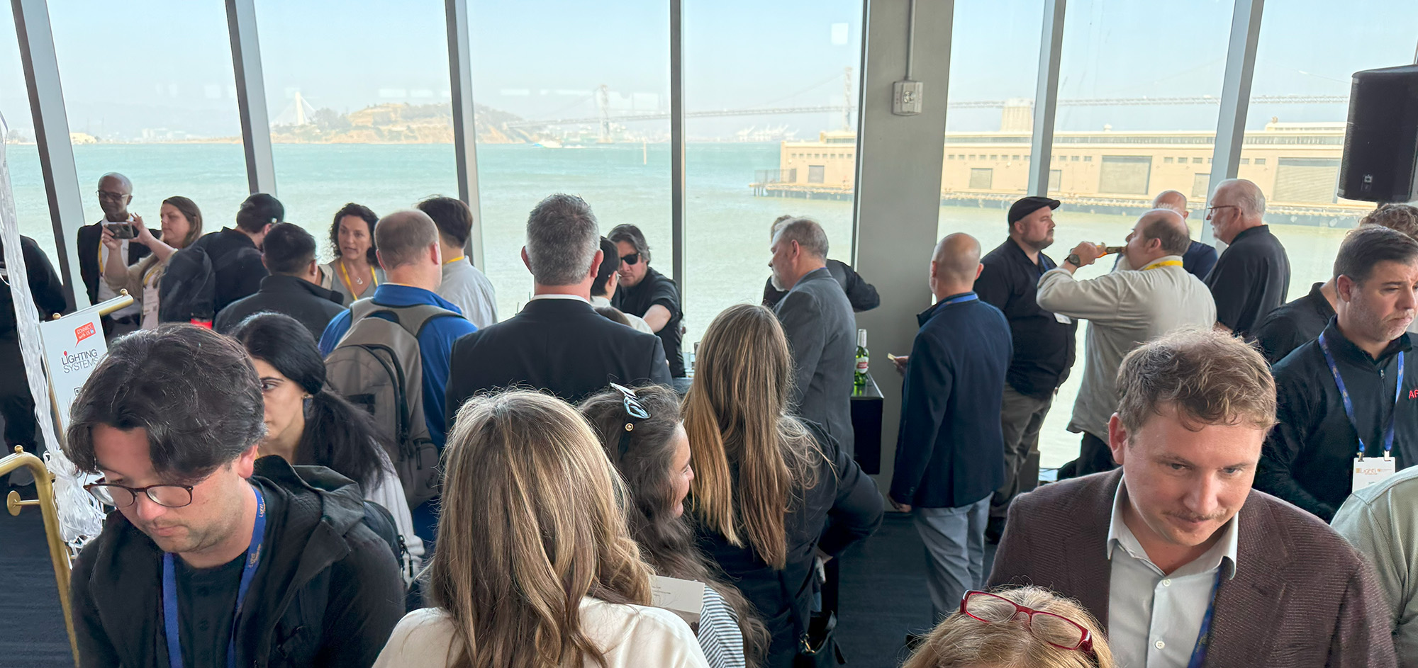 Above: Lighting people take in the scene at Light! Design Expo, with the San Francisco Bay and Bay Bridge providing a striking backdrop.