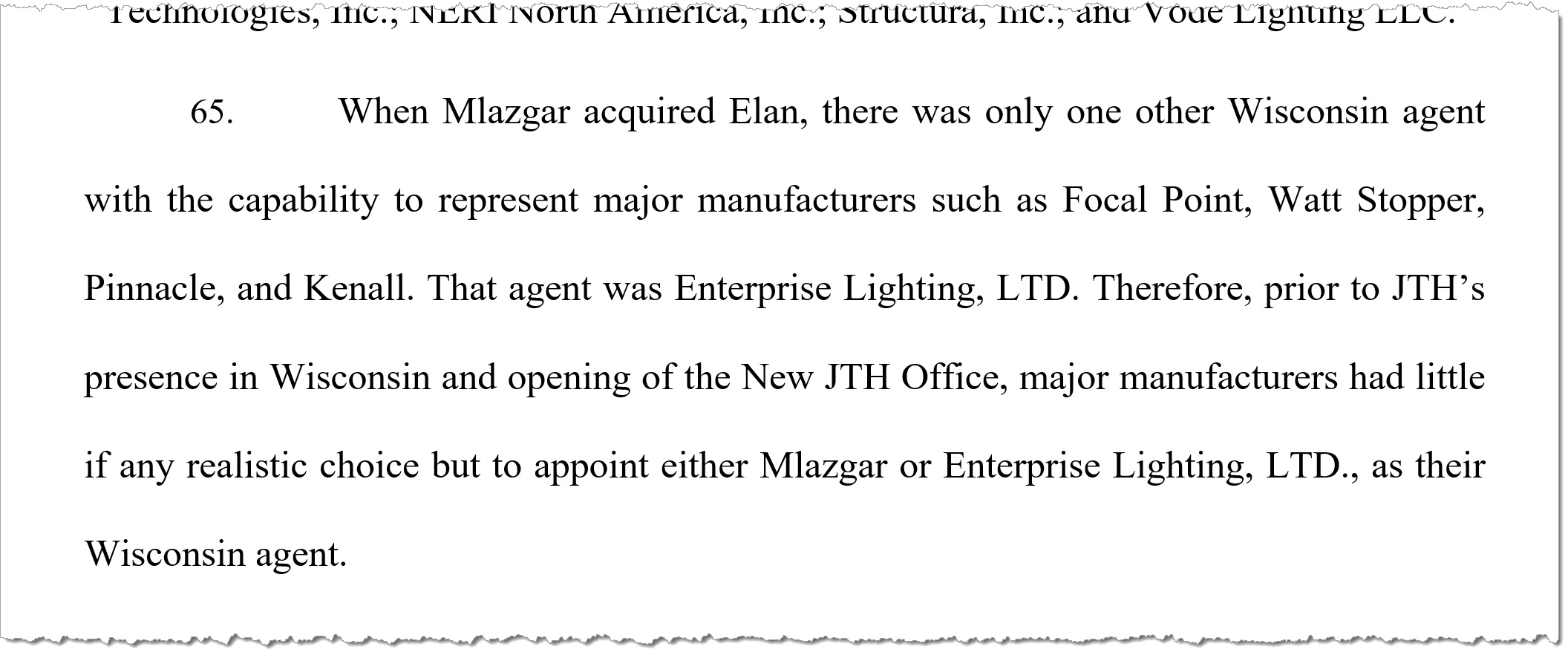 As part of its strategic business moves during the establishment of the new Cooper Lighting partnership, Mlazgar acquired the assets of Elan Lighting, the Cooper Lighting agent at the time. Mlazgar’s lawsuit describes the consolidation of these two major entities as transformative for the Wisconsin market: "When Mlazgar acquired Elan, only one other Wisconsin agent had the capacity to represent major manufacturers such as Focal Point, Watt Stopper, Pinnacle, and Kenall. That agent was Enterprise Lighting, LTD."