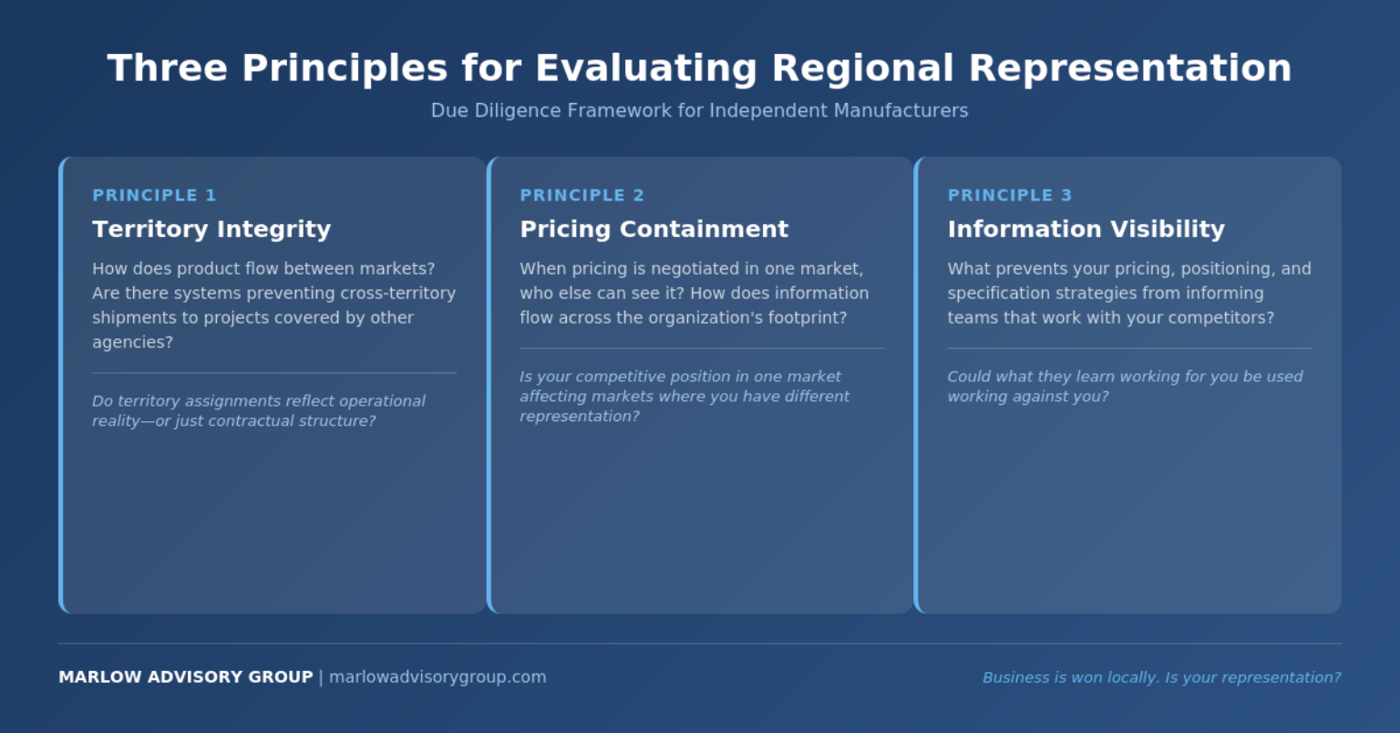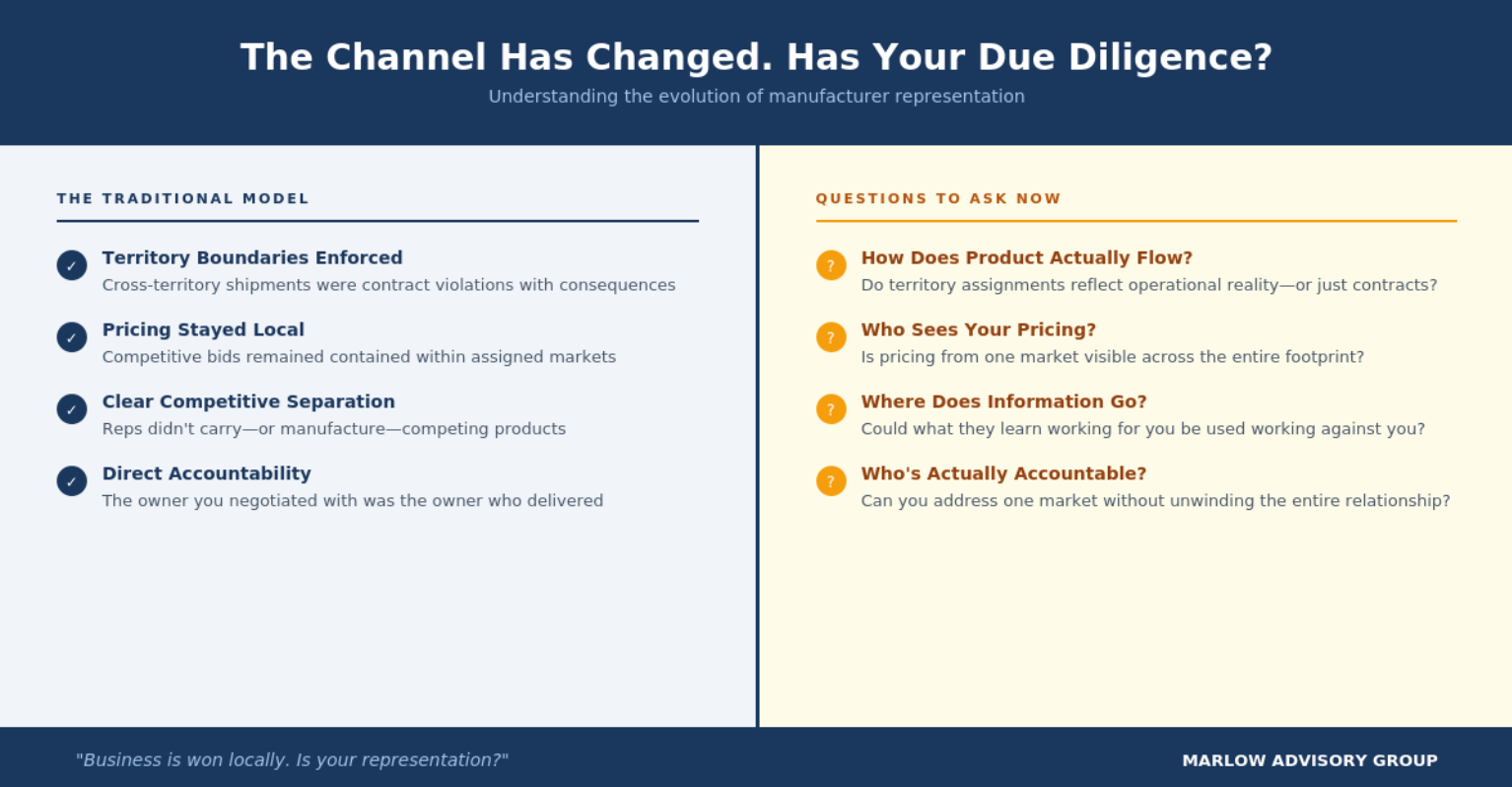 The takeaway for independent manufacturers: Territory assignments that exist on paper may not reflect how business actually flows through a rollup’s internal channels. You must understand the operational reality, not just the contractual structure.