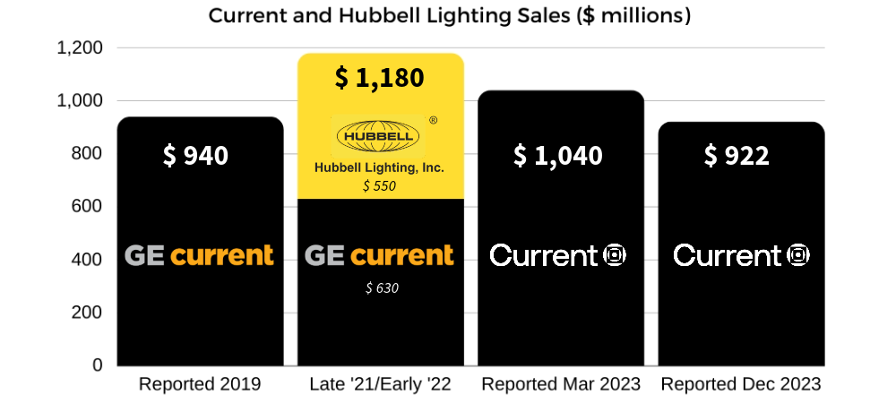 Current, formerly known as GE Current, a Daintree Company, and a portfolio company of private equity firm, American Industrial Partners (AIP), has witnessed a steady decline in its reported sales revenue. The company's annual revenues, most recently updated last week by AIP, have notably regressed to levels observed before the COVID-19 pandemic and prior to its February 2022 acquisition of Hubbell Lighting.