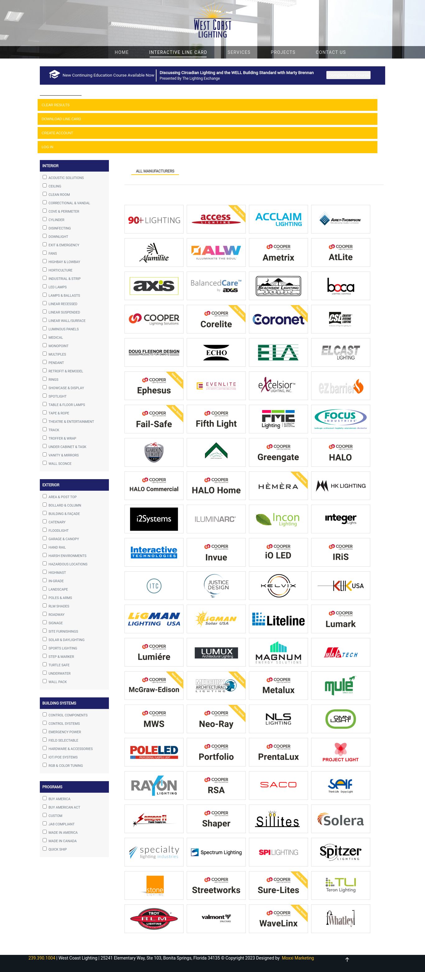 The latest accessible line card we have from West Coast Lighting, dates back to June 2023, lists several well known lighting brands including CSL Lighting, ALW, NLS Lighting, Axis Lighting, Coronet and Omnilight, among others. In July 2023, the agency's website displayed an error message, and the domain wcltg.com has since been redirected to the website of Tampa Bay Lighting, Cooper's agent just north of West Coast Lighting's territory.